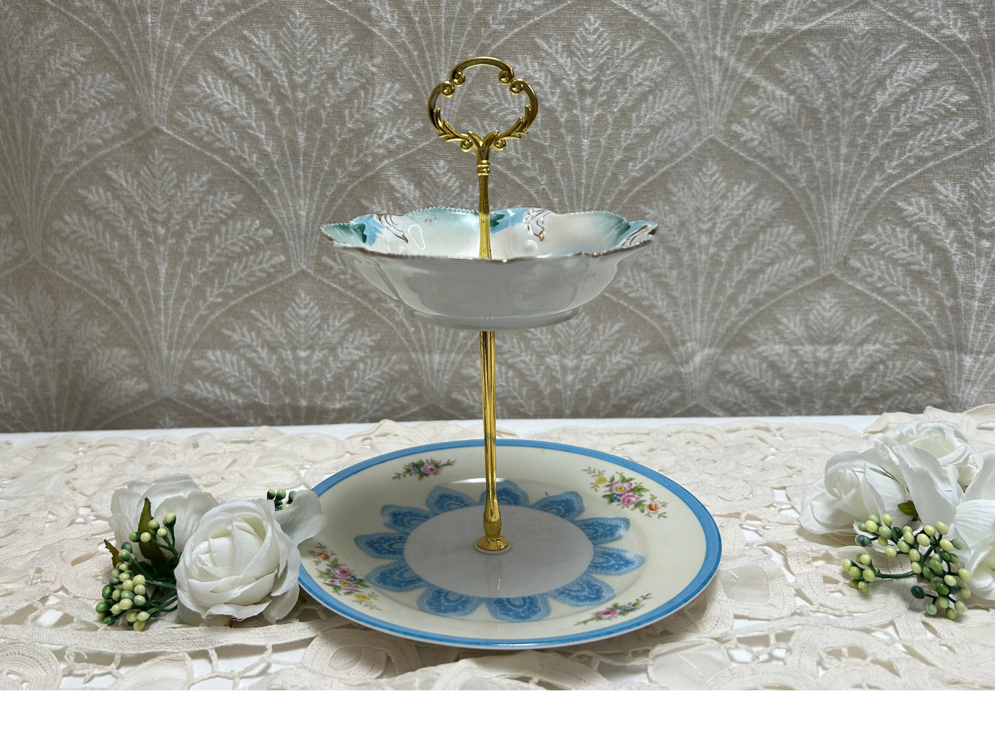 2 tire blue floral hand painted trinket or dessert tray with gold accent